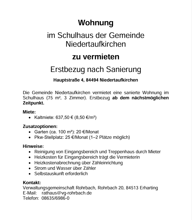 Wohnung im Schulhaus der Gemeinde Niedertaufkirchen zu vermieten